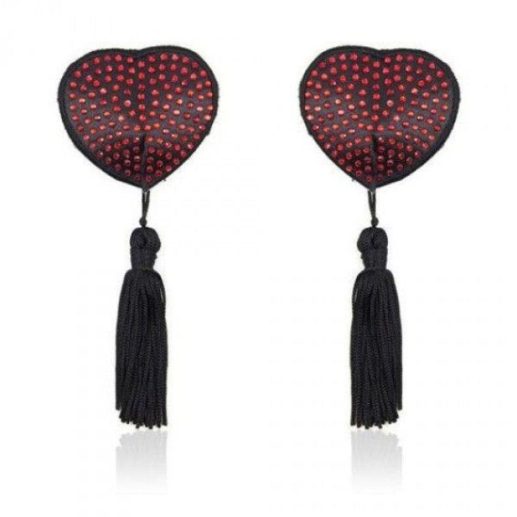 Urocze nakładki na biust w kształcie serca. Całość zdobiona jest czerwonymii diamencikami, a na środku przymocowano figlarny frędzelek. Nakładki są samoprzylepne, wielokrotnego użytku. W zestawie dwie sztuki.