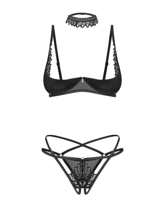 Czarny komplet Donarella to połączenie delikatnych materiałów i odważnego fasonu. Biustonosz z otwartymi miseczkami i fiszbinami eksponuje piersi, zapewniając jednocześnie podtrzymanie i wygodę. Stringi z odkrytym krokiem i koronkowym wykończeniem podkreślają pośladki, a regulowany choker z połyskującą ozdobą dopełnia stylizacji. Projekt stworzony z myślą o kobietach, które chcą zaskoczyć i uwieść spojrzeniem.