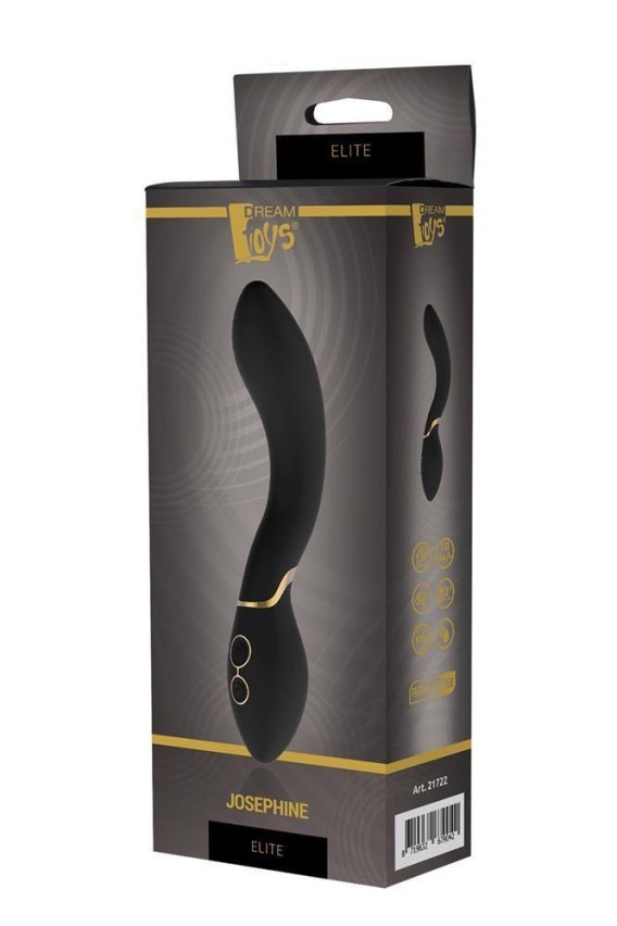Wibrator Josephine z kolekcji Elite firmy Dream Toys to czarny wibrator ze stylowymi złotymi akcentami, zakrzywionym kształtem i dość dużą, elastyczną główką. Mocny silnik oferuje 7 wzorów wibracji i 3 prędkości. Wibrator Josephine można ładować za pomocą dołączonego kabla USB. Wykonany jest z silikonu spożywczego i ABS, wodoodporny i bezpieczny dla ciała IPX7, bez ftalanów i lateksu. Obsługę można wykonać za pomocą 2 przycisków u podstawy wibratora: górny przycisk do włączania / wyłączania wibratora, dolny przycisk do zmiany programów wibracji.