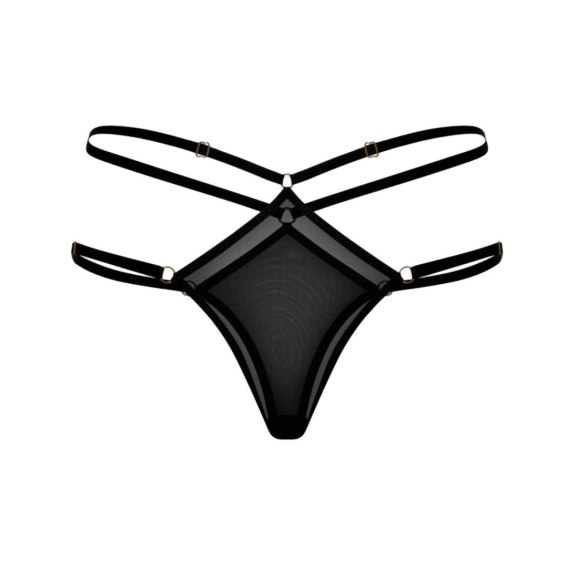 Czarne przezroczyste stringi Reina marki Promees to bielizna, która łączy elegancję z subtelnym erotyzmem, zapewniając jednocześnie komfort i wyjątkowy wygląd. Wykonane z delikatnej, elastycznej siateczki, są trwałe i przyjemne w dotyku, a dzięki 100% bawełnianemu krokowi, oferują ochronę oraz wygodę w najbardziej intymnych miejscach. Transparentny materiał, ozdobiony finezyjnymi paskami oplatającymi biodra i talię, nadaje bieliźnie subtelną zmysłowość. Dodatkowo ekskluzywne złote elementy wzbogacają całość, nadając jej eleganckiego charakteru.