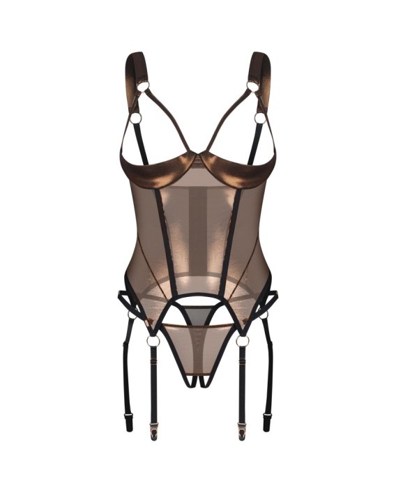 Połyskujący gorset i otwarte stringi Soranna od Obsessive to uosobienie zmysłowej elegancji i kobiecej siły. Transparentna siateczka z delikatnym, złotym połyskiem otula ciało, podkreślając jego kształty i dodając blasku. Fiszbiny pod biustem zapewniają efektowne uniesienie, a pionowe przeszycia wysmuklają sylwetkę, tworząc perfekcyjny efekt wizualny.