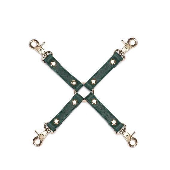 Mossy Chic Leather Hogtie to narzędzie, które umożliwia całkowite ograniczenie ruchu poprzez spięcie nadgarstków i kostek w centralnym, zwartym układzie. Dzięki przemyślanej konstrukcji oraz solidnym materiałom, hogtie ten doskonale sprawdza się w scenach dominacyjnych, które wymagają maksymalnego panowania nad ciałem partnera. Elementy wykonane z naturalnej skóry oraz metalowe klipsy w złotym wykończeniu zapewniają zarówno trwałość, jak i estetykę pasującą do całej kolekcji Mossy Chic.