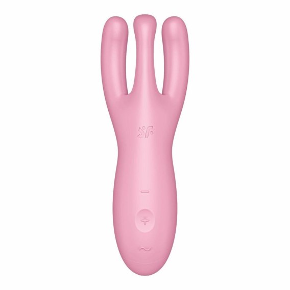 Satisfyer Threesome 4 to wibrator typu lay-on, który zapewnia szeroką i intensywną stymulację łechtaczki oraz warg sromowych. Trzy mocne silniki umieszczone w elastycznych ramionach równomiernie rozprowadzają wibracje: dwa boczne ramiona otulają wargi sromowe, a środkowe ramię skupia się na łechtaczce, oferując dodatkowe wrażenia przy jego opuszczeniu.
